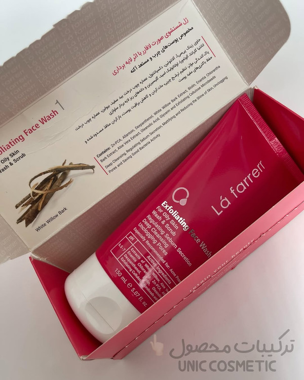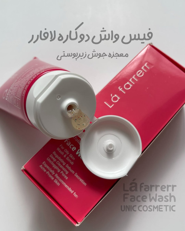 فیس واش و اسکراب لافارر حاوی دونه سلولزی اسکراب است که ترشح چربی را تنظیم کرده و اثر لایه برداری مات کننده ای دارد. این محصول به کاهش براقیت و چربی پوست کمک کرده و منافذ مسدود شده را پاکسازی می کند.